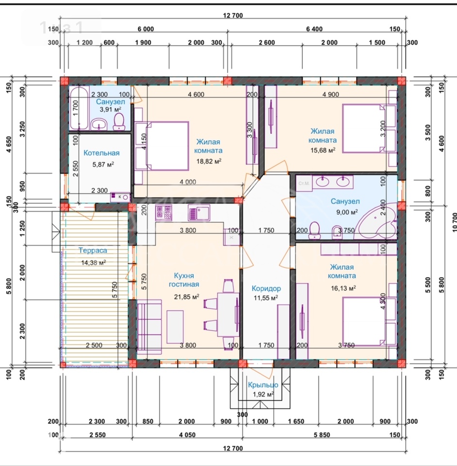 — 2 санузла: 3,9 м² и 9 м².